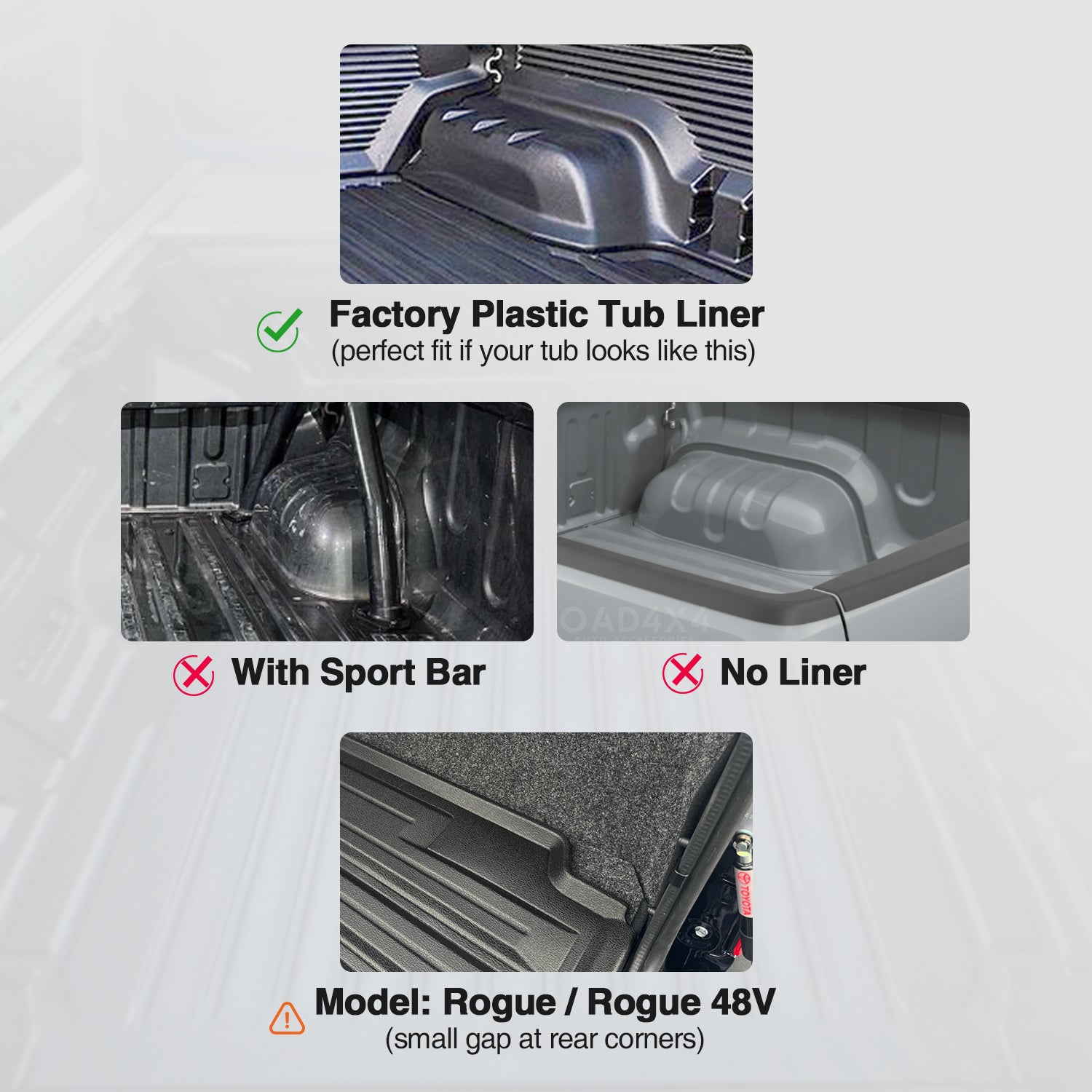 - Note: This item is for badge GR Sport, Rogue, Rogue 48V with Factory Plastic Tub Liner ONLY, does not fit other badges.