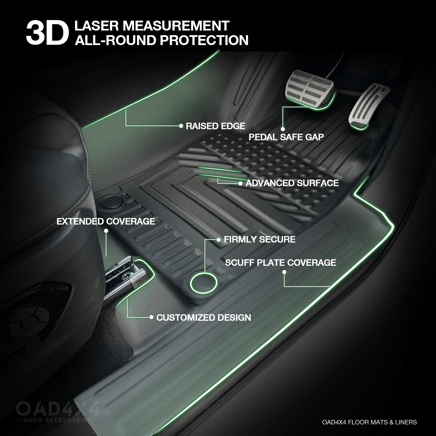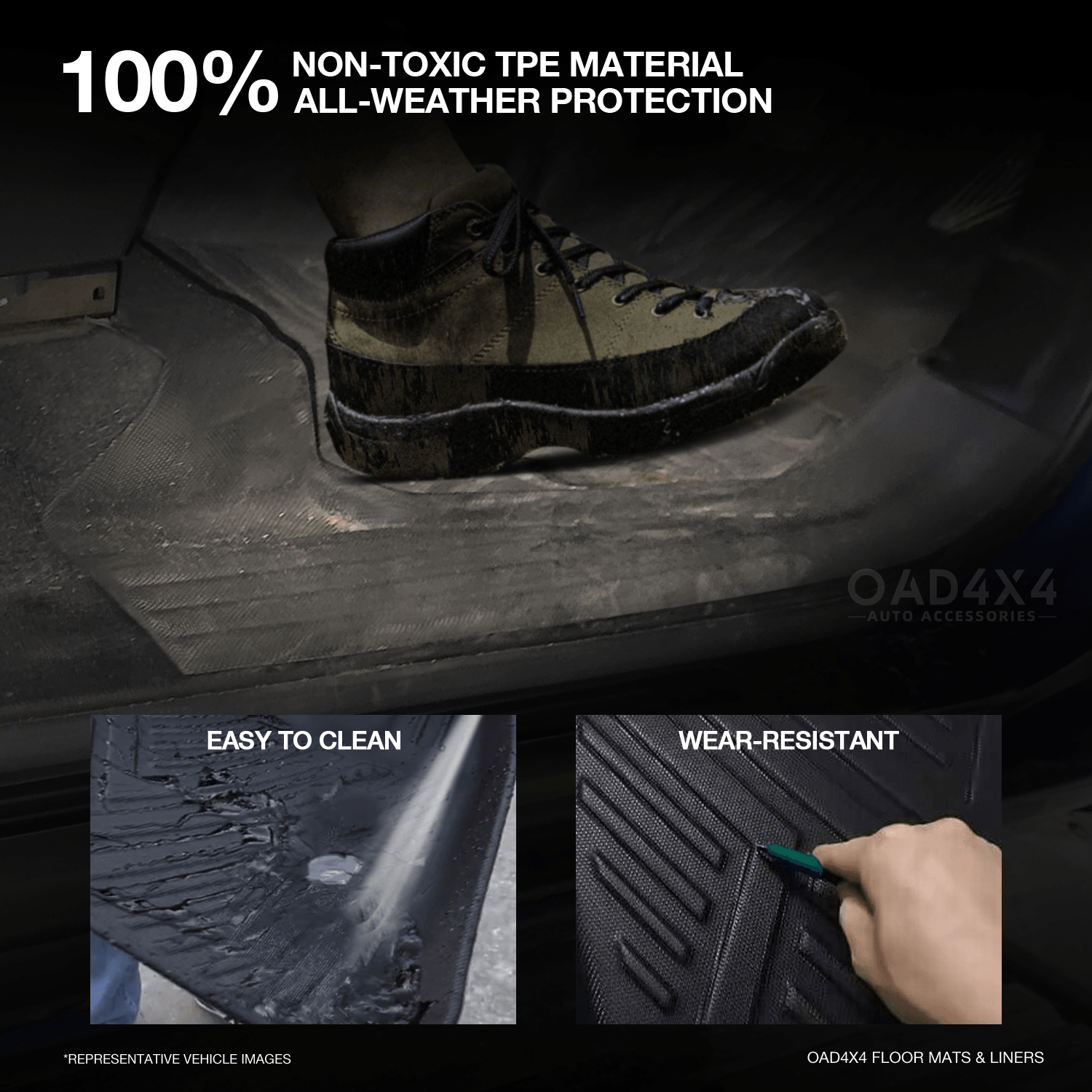 OAD4X4 floor liners are made from premium-grade TPE (Thermoplastic Elastomer), a high-performance material that combines the flexibility of rubber with the strength and durability of plastic, offering excellent resistance to water, dirt, wear, and harsh weather.