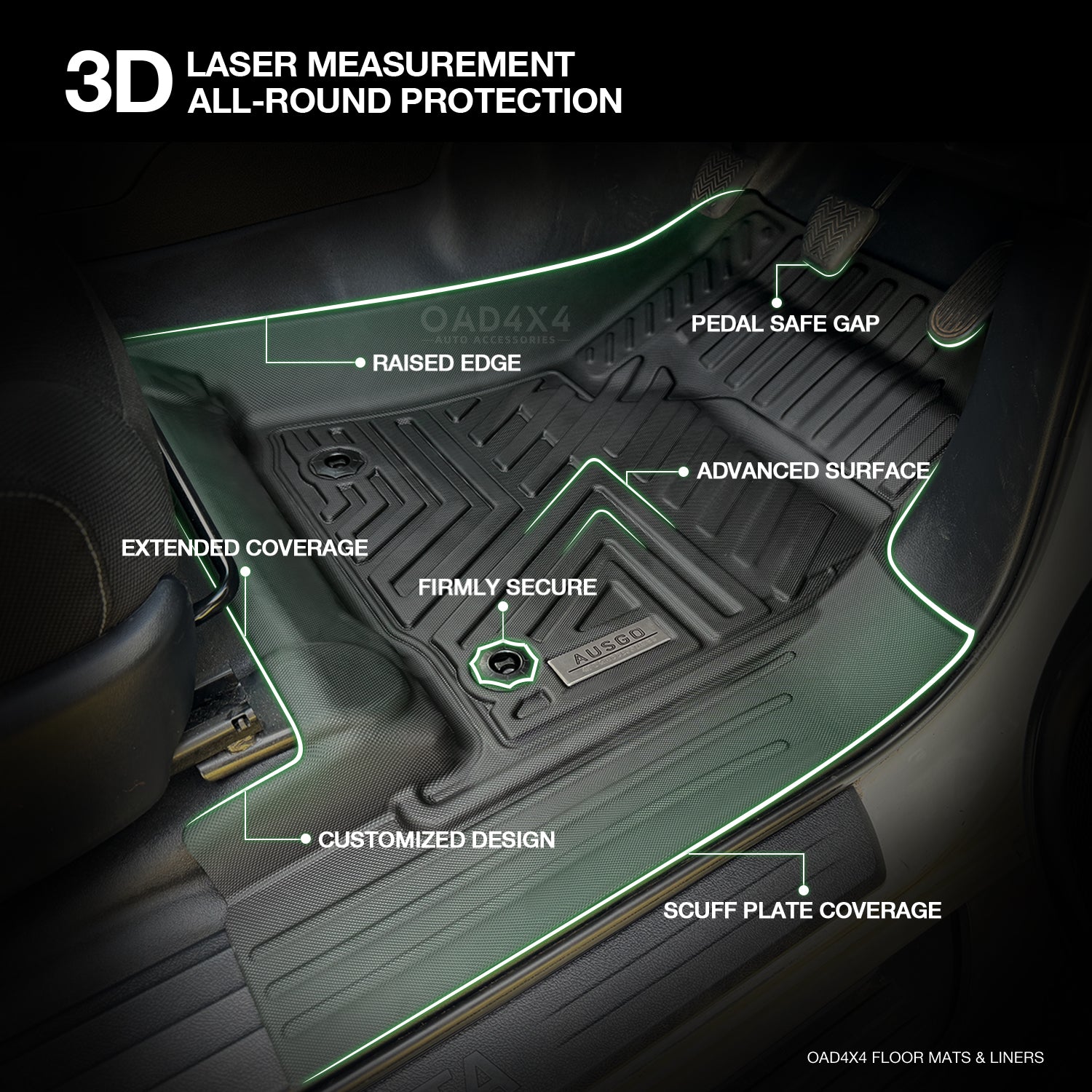 OAD4X4 floor liners are made from premium-grade TPE (Thermoplastic Elastomer), a high-performance material that combines the flexibility of rubber with the strength and durability of plastic, offering excellent resistance to water, dirt, wear, and harsh weather.